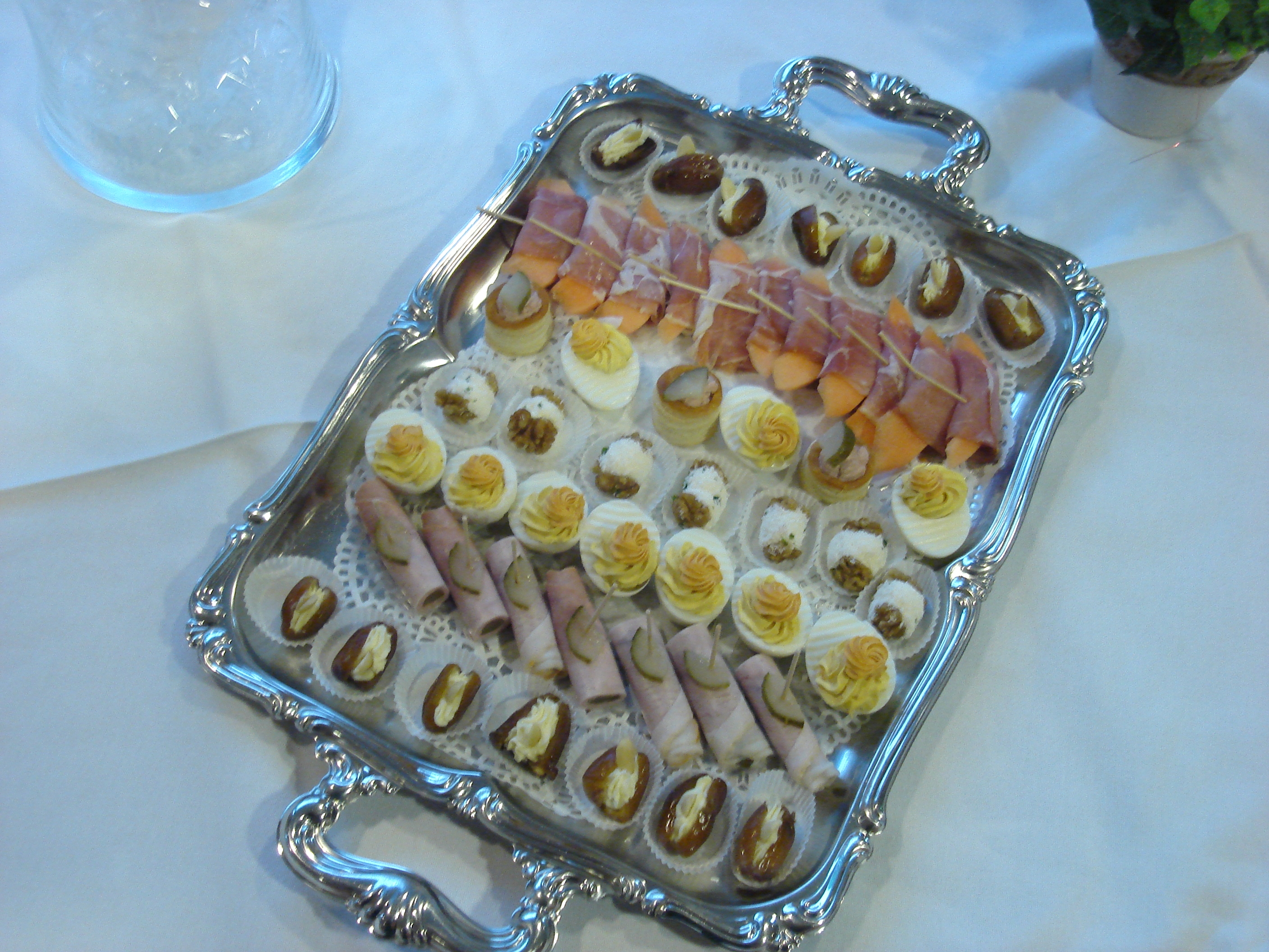 Kaas- worst- en vishapjes, ham met asperges, gevulde eieren, gevulde komkommer, gevulde tomaatjes, rookvlees met ei, partybakjes met Franse kaas - paté en salade.